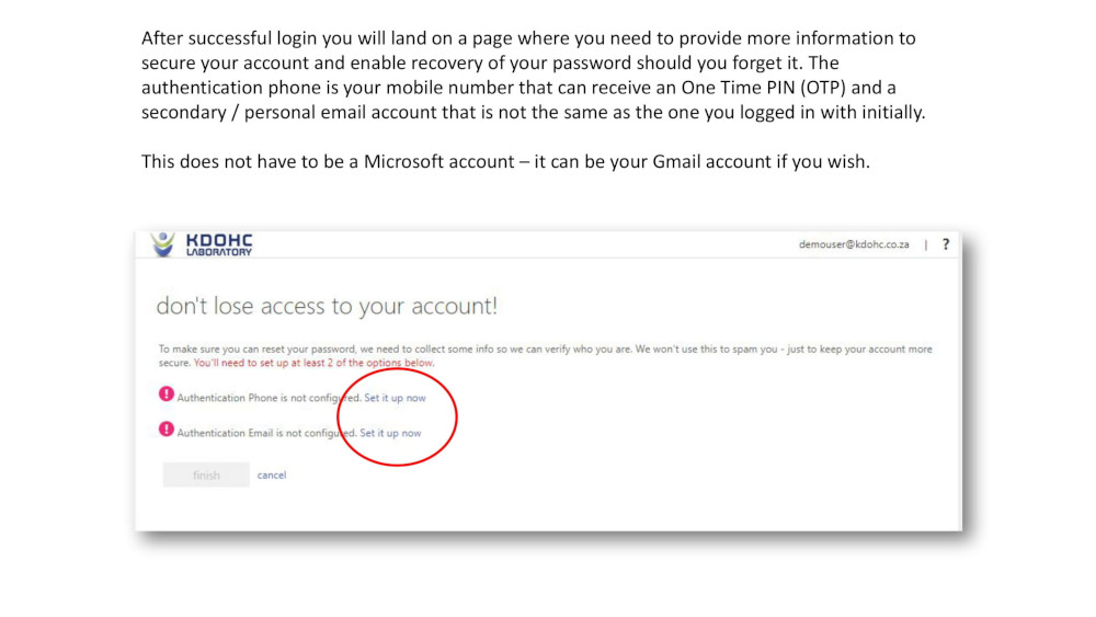 - After successful login, you will land on a page where you need to provide more information to secure your account and enable recovery of your password should you forget it. The authentication phone is your mobile number that can receive a One Time PIN (OTP) and a secondary / personal email account that is not the same as the one you logged in with initially. This does not have to be a Microsoft account – it can be your Gmail account if you wish.